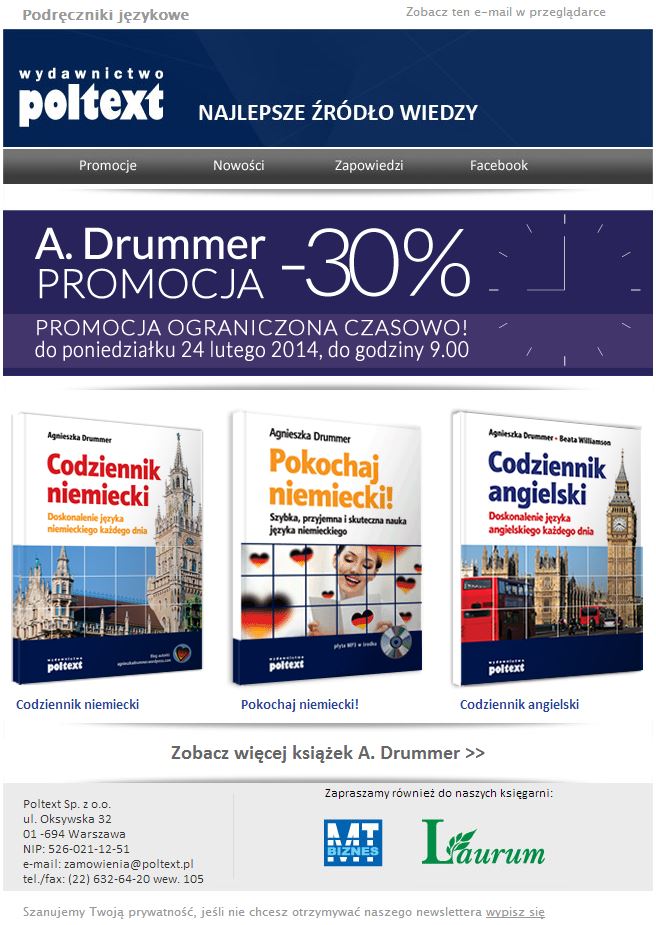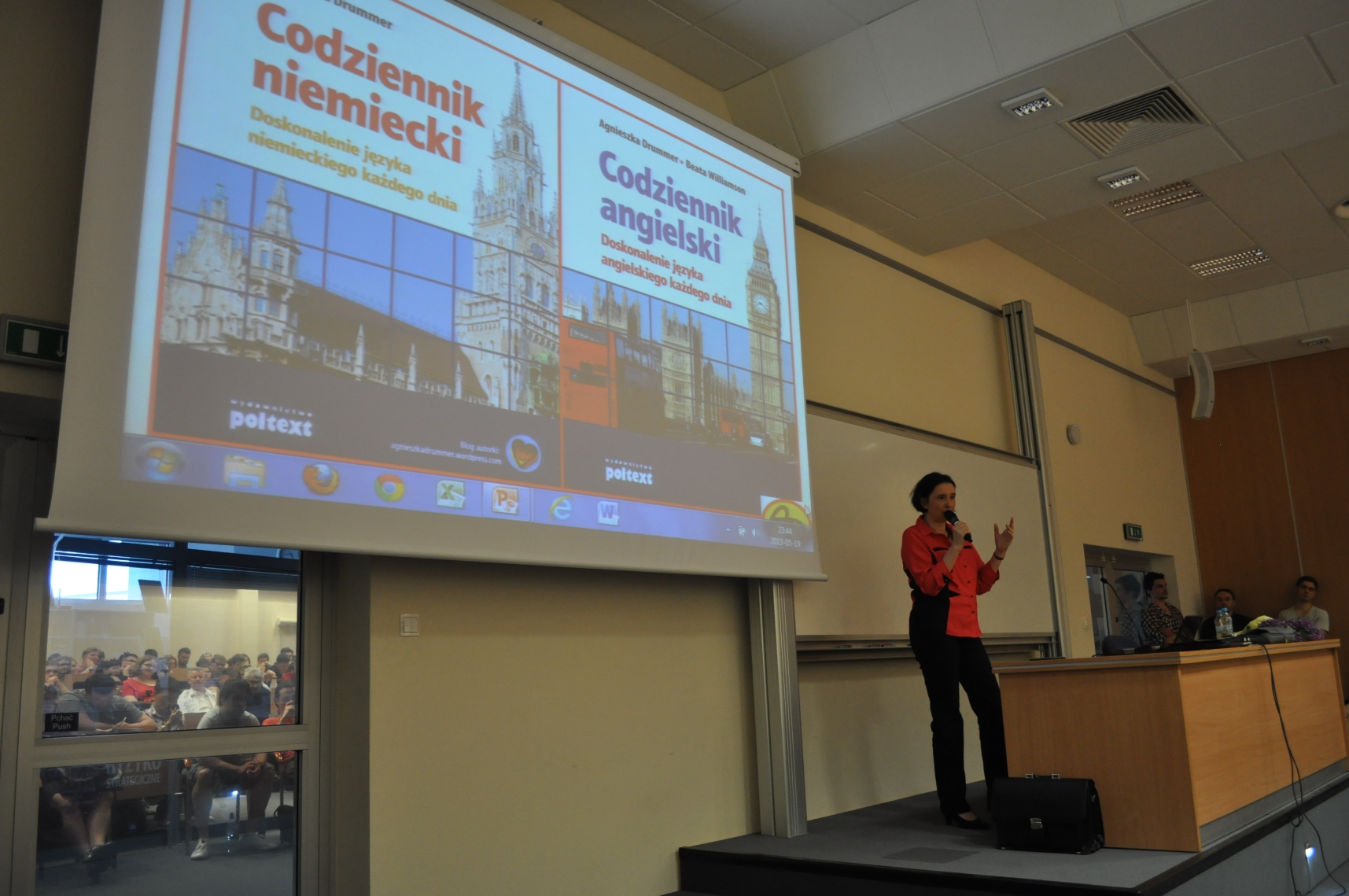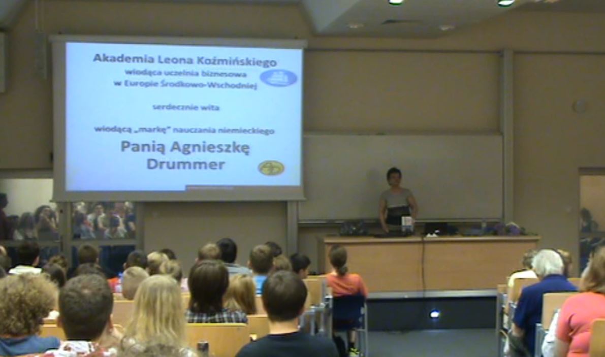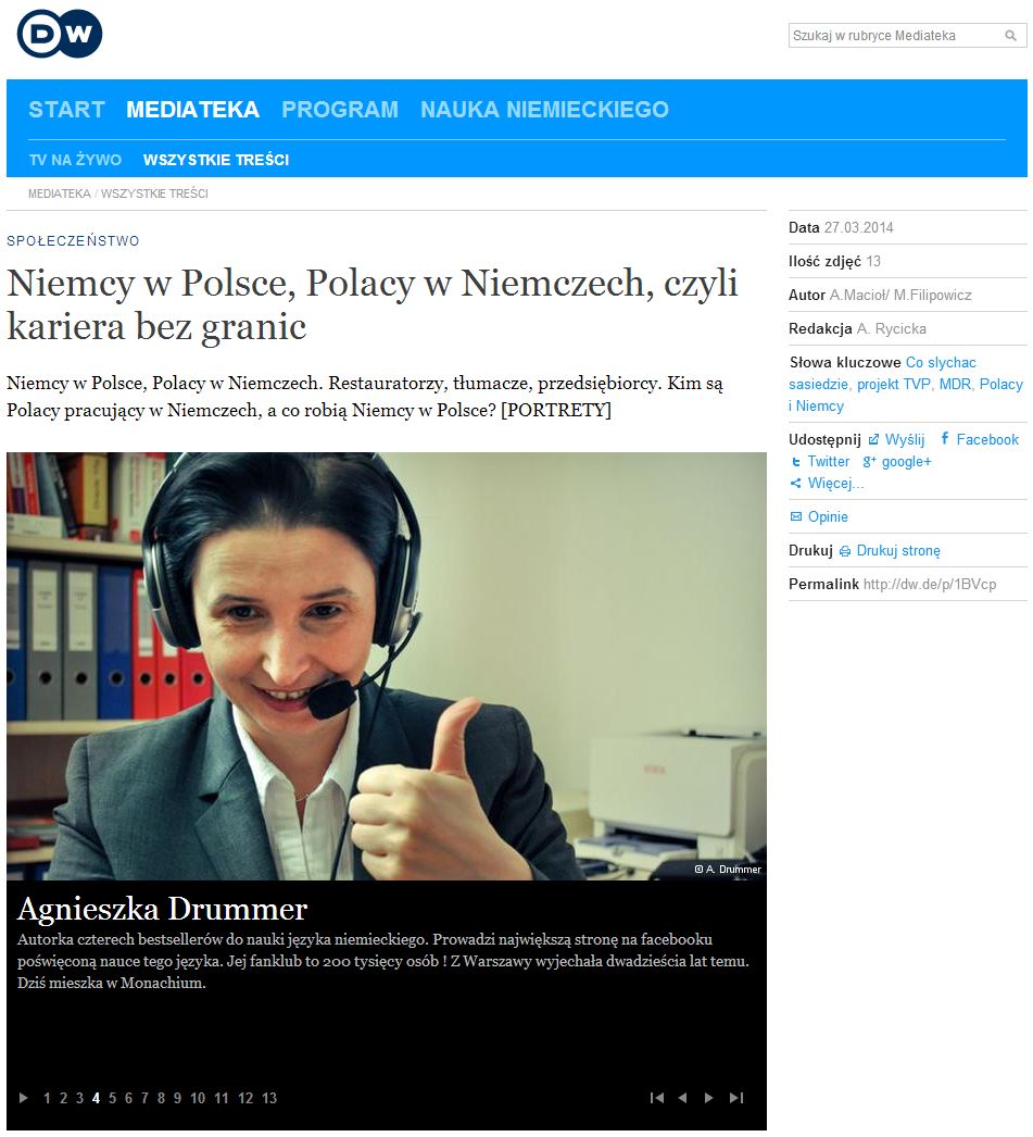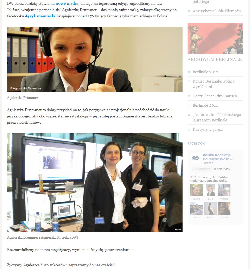 Agnieszka DrummerAgnieszka Drummer – człowiek, o którym można mówić pasjami. Ona sama, jak mało kto, potrafi rozprawiać o swoim ’koniku’ – języku niemieckim. Zaraża innych zapałem do nauki, umiejętnie zaprzęgając energię, nieprzeciętną intuicję belfra i elektroniczne media. Przykład: „JĘZYK NIEMIECKI”- strona, którą Agnieszka założyła na facebooku. Prosty pomysł okazał się strzałem w dziesiątkę. Kilkudziesięciotysięczna(!) grupa osób połknęła przynętę microlearningu – ulubionej metody nauczania twórczyni strony, i wpadła w sieci dydaktycznego talentu Agnieszki. Na stronie czuć ducha niesztampowej administratorki. Zapytałam Agnieszkę jak pokochać niemiecki. DW: „Język niemiecki” skupił w krótkim czasie kilkadziesiąt tysięcy fanów. Skąd pomysł na tę stronę i w czym tkwi jej sukces? AD: Pomysł nie jest nowy. Od dawna wiadomo, że regularna – choćby krótka – nauka jest skuteczniejsza niż nawet dłuższa, ale mniej regularna. Nowocześnie nazywa się to „microlearning”. A skąd taka popularność? Pewnie z tego, że facebook to portal dający każdemu prostą i szybką możliwość reakcji, a nie tylko biernego odbioru. Na podobnej zasadzie ’żyje’ Wasza strona na tzw. portalu.. DW: Jesteś nauczycielem, który podobno udziela lekcji online?