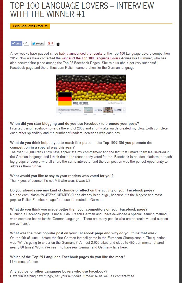 1 czerwca 2012. Wygrywamy w konkursie na NAJLEPSZĄ NA ŚWIECIE STRONĘ FACEBOOKOWĄ DO NAUKI JĘZYKÓW! (Oryginał można przeczytać tu – KLIK.)