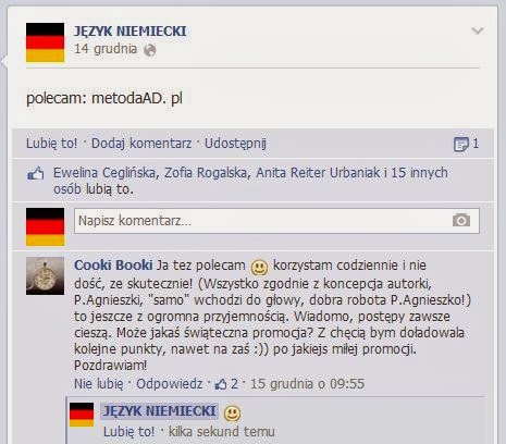 Pani Agnieszko, pilnie uczę się metodą AD… Pani metoda nauki sprawdza się rewelacyjnie. Wszystko pojmuję w mig, choć w DE chodzę również do szkoły, to jednak Pani metoda dociera do mnie o wiele lepiej!!!